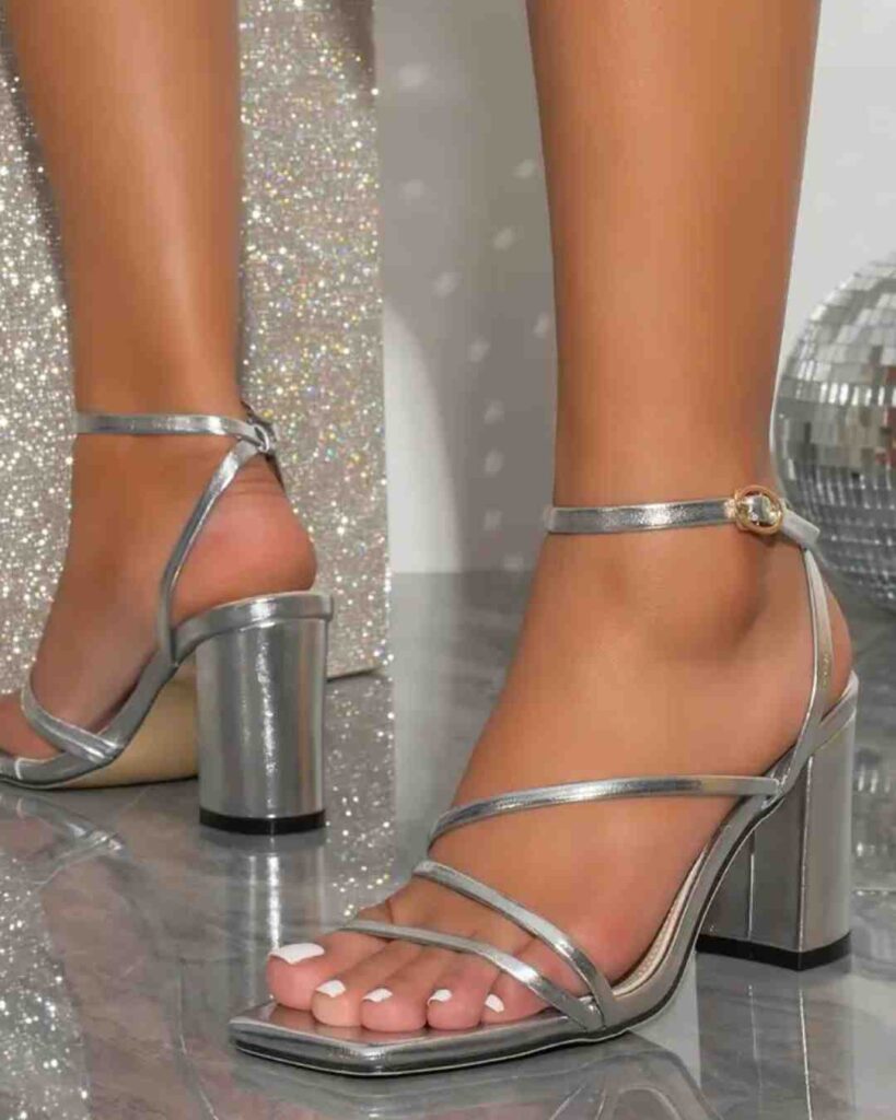 These sparkling silver block heels bring a pretty mix of shimmer and simplicity, making them perfect for parties, weddings or any dressy moment. The silver finish gives them a cute glow, and the embellished front strap adds that little extra sparkle without going overboard. Even though they’re not nude heels, they still feel neutral enough to match lots of outfits.