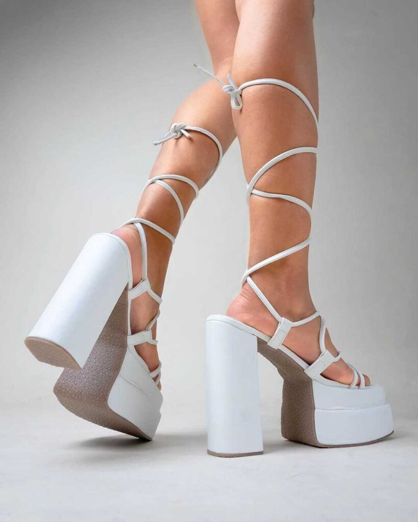 These ultra modern white platform heels bring a dramatic look with their tall platform base and clean white finish. The lace-up straps wrap around the legs in a soft, flattering way that makes the whole style feel edgy but still pretty. Even though they’re not nude heels, the neutral color keeps them easy to pair with different fits.
