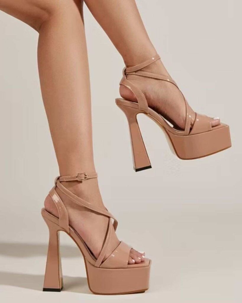 These nude heels serve a whole look with their tall stilettos platform design and glossy finish. The straps wrap around the ankle in a clean, stylish way that makes the whole fit feel polished. They give serious height while still keeping things balanced and cute.