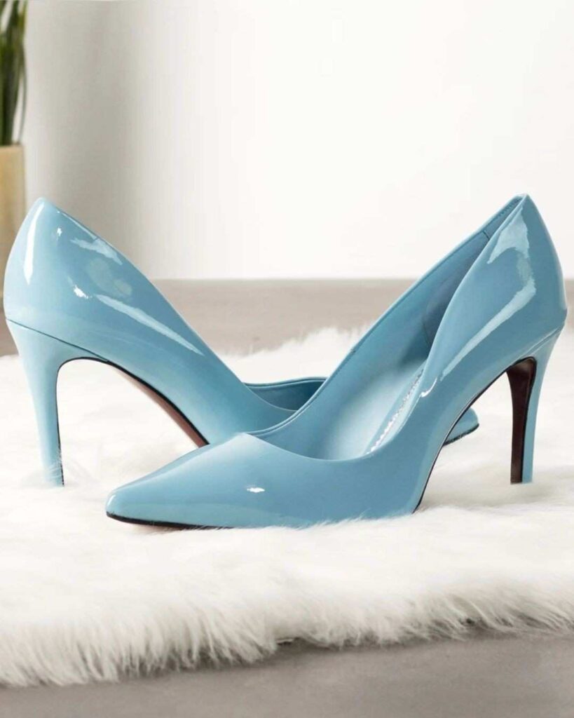 These glossy sky blue heels bring a clean and polished vibe that feels easy to style. The pointed toe keeps things sharp while the smooth finish gives them the softness you usually see in nude heels. They’re a cute pick if you want heels that stand out without doing too much.