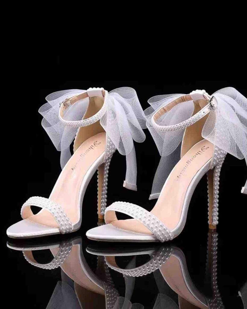 These pearl bow stilettos heels give a dreamy look with their pearl details and sheer bow accents. Even though they have that wedding-shoe vibe, they still work for any fancy moment where you want something prettier than your usual nude heels. The soft white shade keeps them clean and classy, while the shimmer hits just right.
