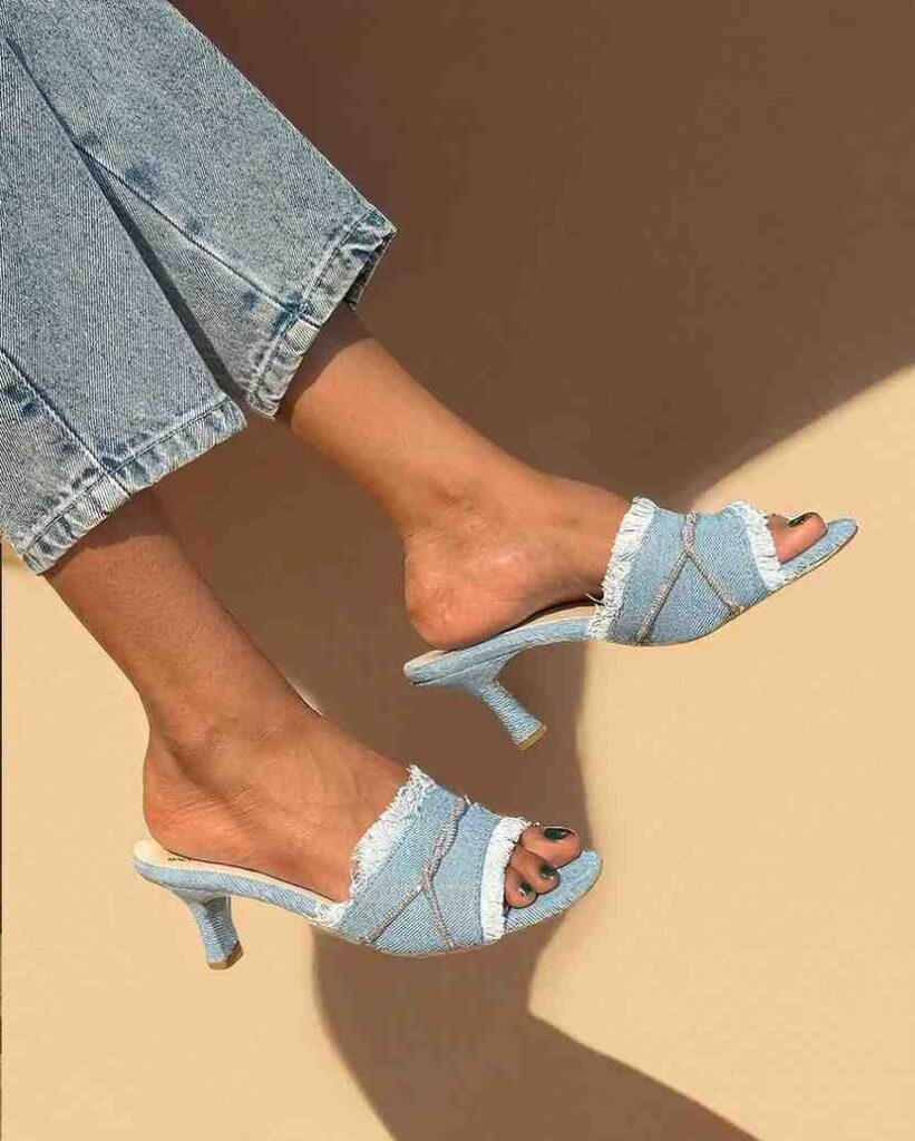 These denim high heels bring a laid-back vibe while still looking stylish. The frayed edges and soft blue color make them feel playful and easy to pair with casual outfits. Even though they’re not nude heels, they still blend well with different looks.