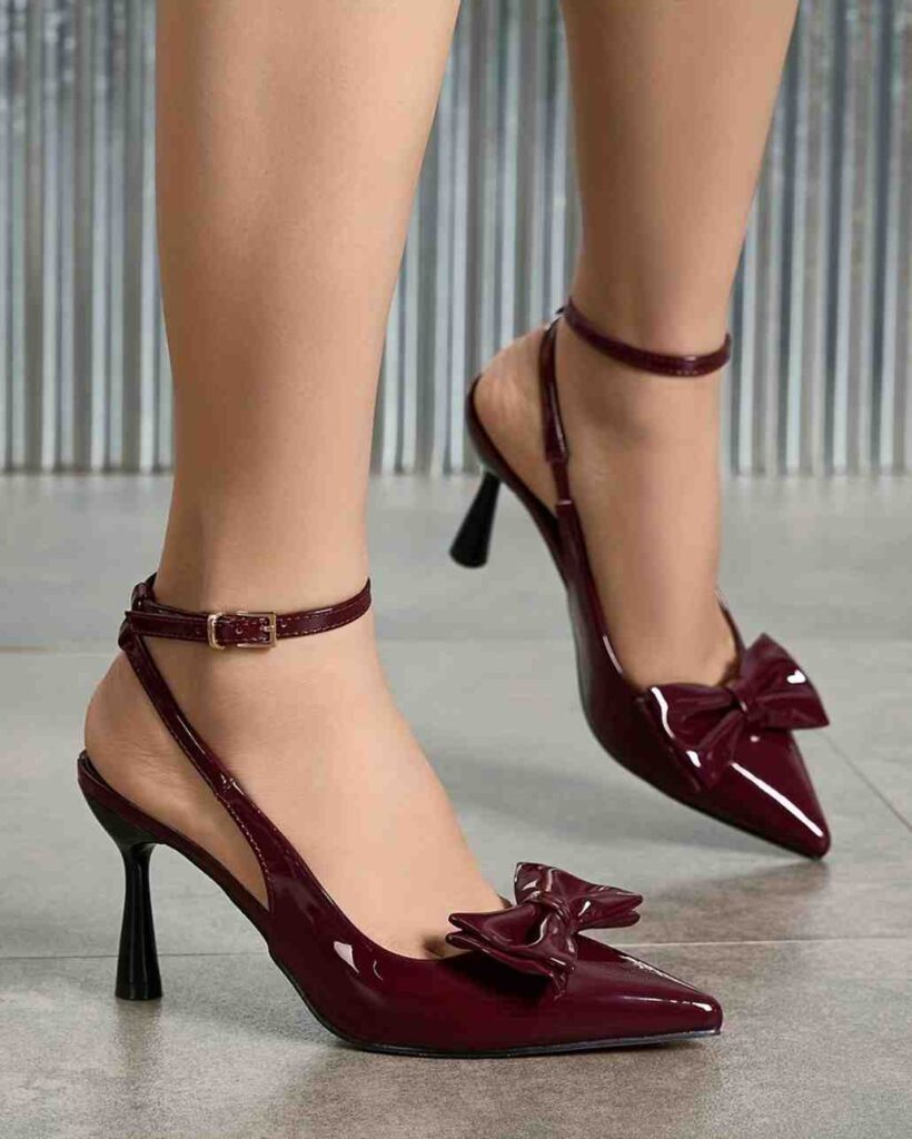 These chic burgundy stiletto heels offer a perfect blend of elegance and fun. The glossy patent finish and delicate bow accent on the pointed toe add a playful yet sophisticated touch, making them a standout choice for evening events or date nights. Even though they aren’t nude heels, their deep hue still offers a classic, stylish appeal.